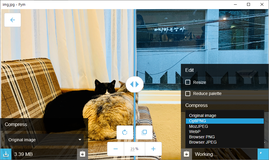 왼쪽 위부터 살펴보면 제가 압축할 사진의 용량인데요, 3.39MB로 낮지 않은 용량이죠.