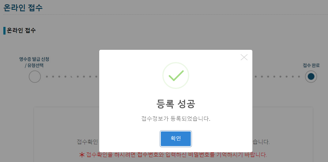 나중에 접수 확인을 하실 때 접수번호와 비밀번호가 필요하니 메모해주시는 게 좋을 것 같아요.