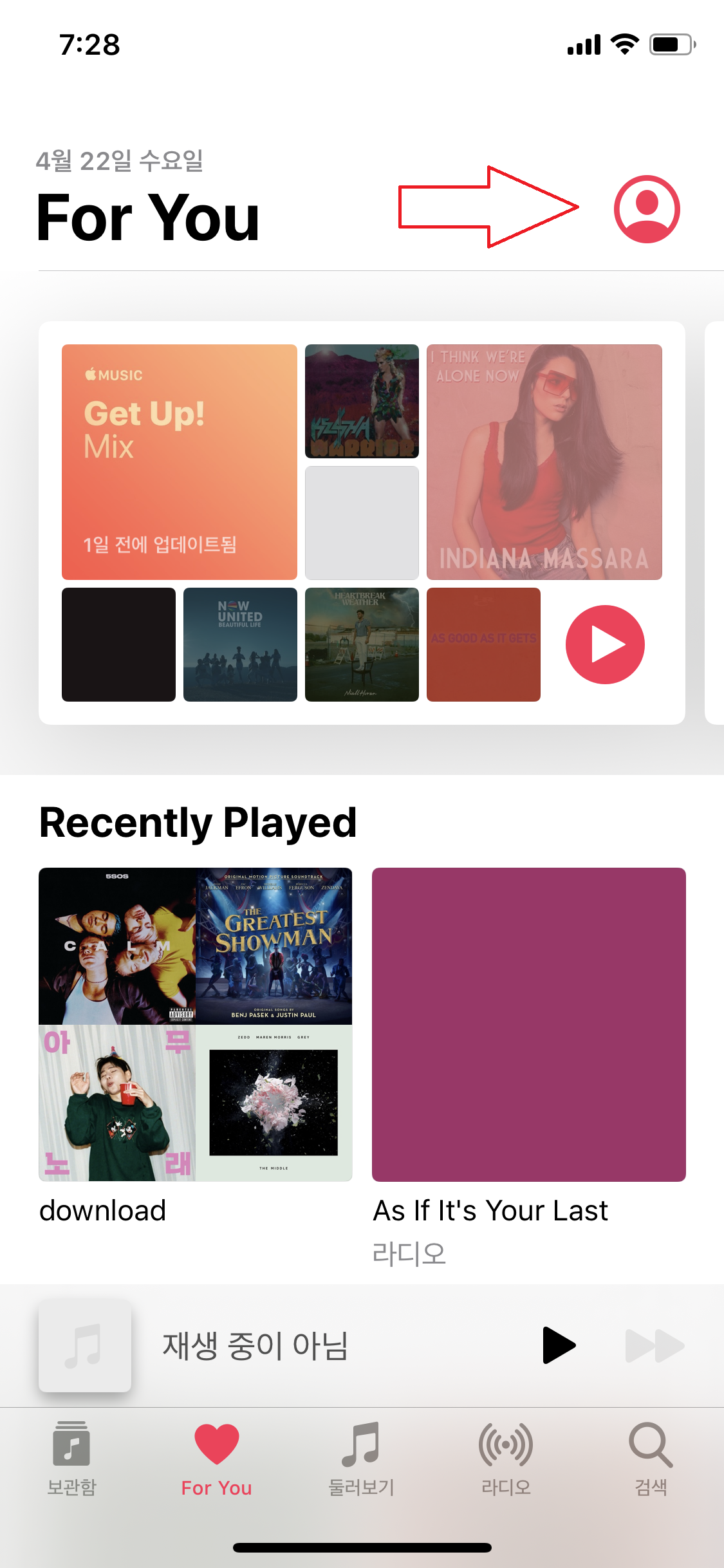 이번에는 애플 뮤직 앱을 키시고 For You를 들어가 주세요.