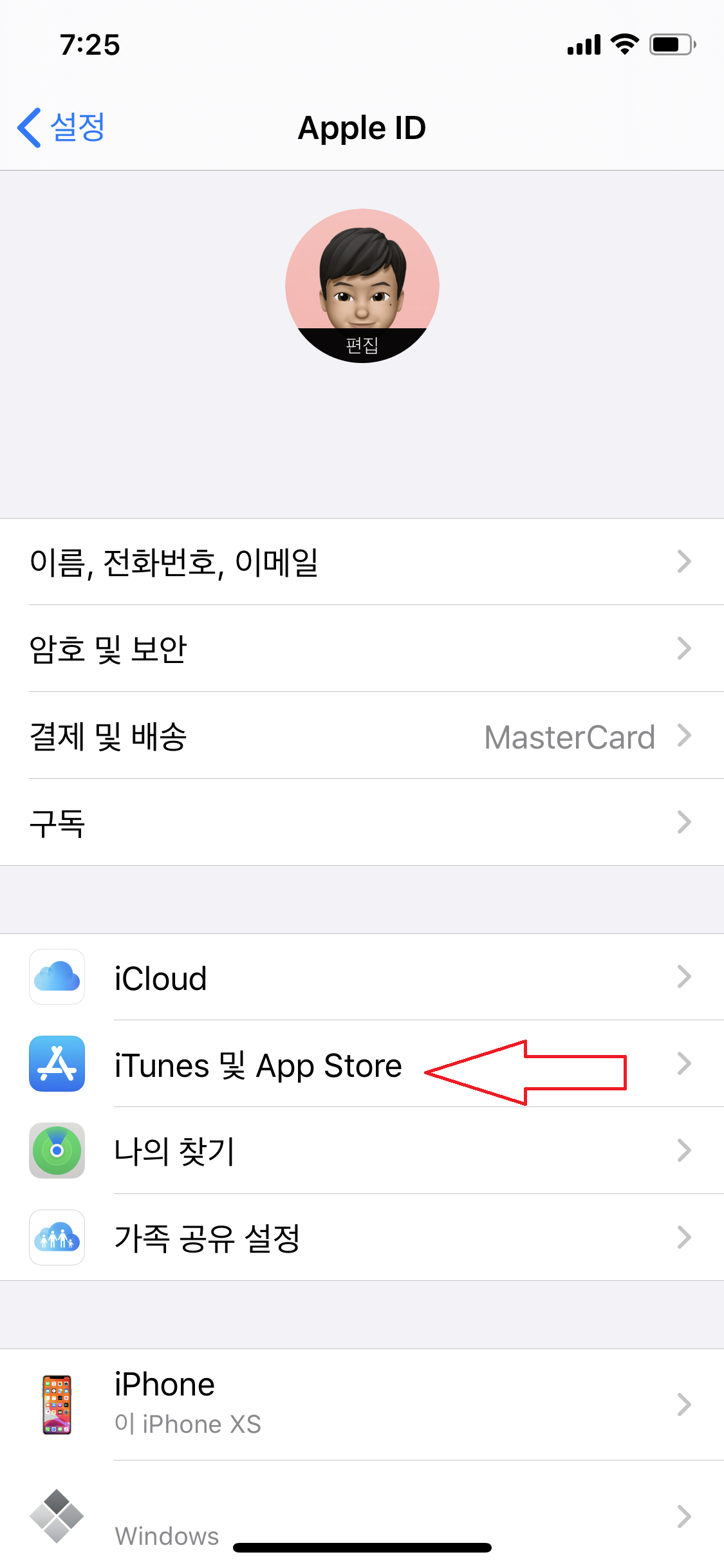iTunes 및 App Store 란을 클릭해줍니다.