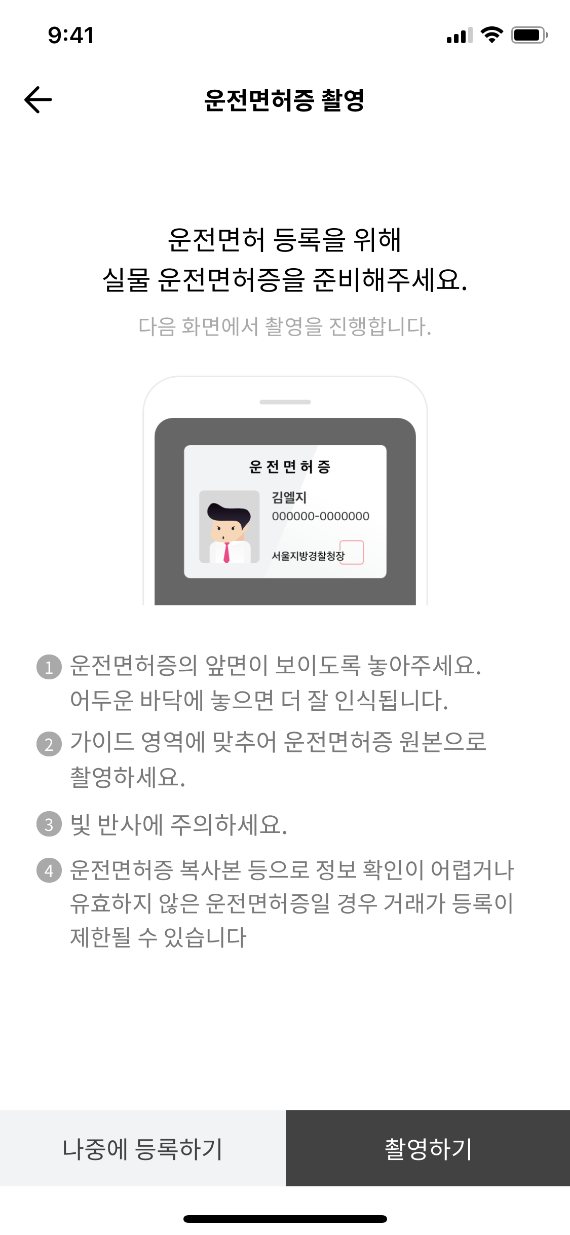 이제 본인 신분증의 사진을 찍어주셔야 합니다.