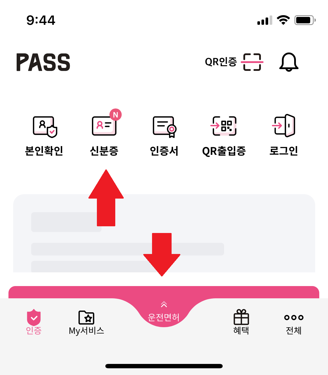 상단의 신분증을 클릭해주시거나 하단의 운전면허를 클릭해주세요.