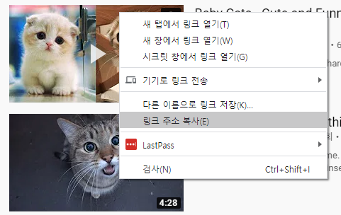 다운로드하고 싶은 영상을 마우스 오른쪽 클릭 후 "링크 주소 복사"를 눌러주세요.