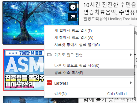 원하시는 영상을 찾으셨으면 영상을 마우스 우클릭 후 "링크 주소 복사"를 눌러주세요.