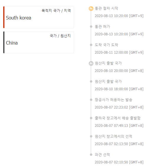 중국 내에서 배송이 이루어지다가 항송 편에 8월 10일 날 도착하게 되었네요.
