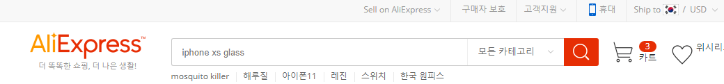 알리익스프레스 홈페이지 우측 상단에 보시면 태극기와 USD가 보이시나요?