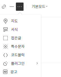 지도는 기본적으로 새 글 페이지 상단에 있는 퀵바에서 ... 을 클릭하시면 나오는 버튼을 클릭해서 삽입할 수 있어요.